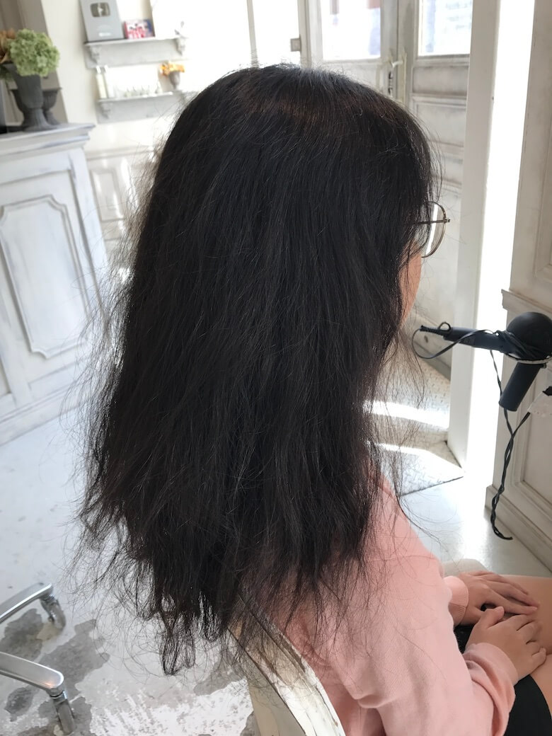 髪の状態は昨年7月に他店ではじめて縮毛矯正と毛先ワンカールをかけた状態なのですが、毛先がうねってまとまらないのが悩みです…。[/voice]